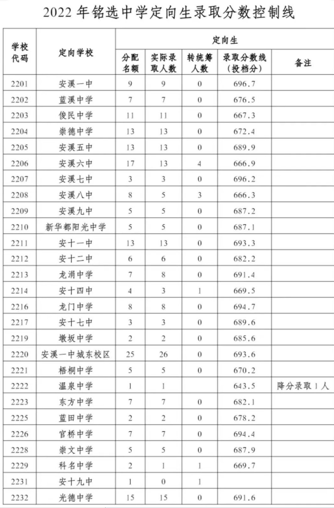 1、安溪县2022年中招一级达标高中统招最低录取分数线已划定,具体如下:
